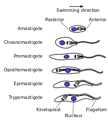 Trypanosoma is a genus of kinetoplastids (class Trypanosomatidae[1]), a monophyletic[2] group of unicellular parasitic flagellate protozoa. Trypanosoma is part of the phylum Sarcomastigophora.[3] The name is derived from the Greek trypano- (borer) and soma (body) because of their corkscrew-like motion. Most trypanosomes are heteroxenous (requiring more than one obligatory host to complete life cycle) and most are transmitted via a vector. The majority of species are transmitted by blood-feeding invertebrates, but there are different mechanisms among the varying species. Some, such as Trypanosoma equiperdum, are spread by direct contact. In an invertebrate host they are generally found in the intestine, but normally occupy the bloodstream or an intracellular environment in the vertebrate host.