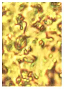 The species was described in 2005 by George Poinar Jr. in the journal Vector-Borne & Zoonotic Diseases from metatrypanosomes preserved in several fecal pellets encased in Hymenaea protera amber.[2] The fossil was recovered in the Dominican Republic from early Miocene Burdigalian stage deposits on the island of Hispaniola.[2][3] Included with the pellets and thought to be the origin for them, is the extinct kissing bug Triatoma dominicana.[2] This association is the oldest known example of the vector association between Triatoma and Trypanosoma. The holotype, deposited in the Oregon State University as specimen number P-3-3, was mined from the La Toca mine in the Dominican Republic. T. dominicana and T. antiquus lived in an environment similar to modern moist tropical rain forests.[2] The preserved metatrypanosomes range in size from 11 to 20 µm with the average length being 15 µm. The species is placed in the Trypanosoma subgenus Schizotrypanum, and is identifiable by age and the average length being shorter than that of other Schizotrypanum species. Based on the contents of the amber specimen including three hematophagous insects, it is likely to have been formed in a tree cavity.[2] Associated with the insects are several mammal hairs from an unidentified Chiropteran, the likely host for T. dominicana. The pellets are thought to have been deposited after the T. dominicana finished feeding on the host bat.[2] Modern bat-hosted trypanosomes in the region are considered a vector for the fatal Chagas disease in humans.[2]