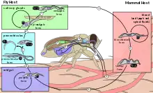 Sometimes, wild animals can be infected by the tsetse fly and they act as reservoirs. In these animals, they do not produce the disease, but the live parasite can be transmitted back to the normal hosts.[72] Besides preparation to be taken up and vectored to another host by a tsetse fly, transition from LS to SS in the mammal serves to prolong the host's lifespan controlling parasitemia aids in increasing the total transmitting duration of any particular infested host.[74][2]