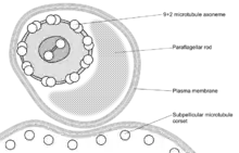 These names are derived from the Greek mastig- meaning whip, referring to the trypanosome's whip-like flagellum. The trypanosome flagellum has two main structures. It is made up of a typical flagellar axoneme, which lies parallel to the paraflagellar rod,[63] a lattice structure of proteins unique to the kinetoplastids, euglenoids and dinoflagellates.[64][65]