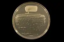 An agar plate containing tryptone supporting growth of a micro-organism.
