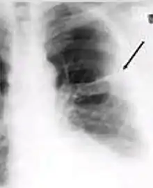 - Diaphragmatic tenting - A localized accentuation of the normal convexity of the hemidiaphragm as if "pulled upwards by a string."