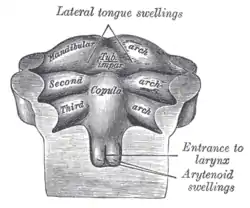 The median tongue bud (also tuberculum impar) marks the beginning of the development of the tongue. It appears as a midline swelling from the first pharyngeal arch late in the fourth week of embryogenesis.[1] In the fifth week, a pair of lateral lingual swellings (or distal tongue buds) develop above and in line with the median tongue bud. These swellings grow downwards towards each other, quickly overgrowing the median tongue bud.[1] The line of the fusion of the distal tongue buds is marked by the median sulcus.[1]