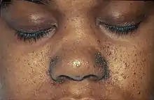 - Facial angiofibromas are present in about 75% of people with TSC.[10] These are a rash of reddish spots or bumps on the nose and cheeks in a butterfly distribution, which consist of blood vessels and fibrous tissue. This potentially socially embarrassing rash starts to appear during childhood.