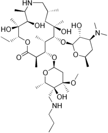 Tulathromycin, sold under the brand name Draxxin among others, is a macrolide antibiotic used to treat bovine respiratory disease in cattle and swine respiratory disease in pigs.[1][5][6]