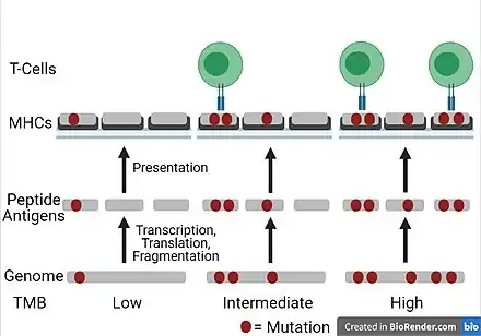 One survival mechanism in tumors is to increase the expression of immune checkpoint molecules that can bind to tumor-specific T-cells and inactivate them, so that the tumor cells cannot be detected and killed.[8] ICIs have been shown to improve patients’ response and the survival rates as they help the immune system to target tumor cells.[1][8] However, there is a variation in response to ICIs among patients and it is crucial to know which patients can benefit from ICI therapy.[1] The expression of PD-L1 (programmed death-ligand 1; one of the immune checkpoints) has been demonstrated to be a good biomarker of PD-L1 blockade therapy in some cancers.[8] However, there is a need for better biomarkers as there are some predictive errors with PD-L1 expression.[8] Studies on TMB have illustrated that there is an association between patients’ outcome (of ICI therapy) and the TMB value.[1] It has been proposed that TMB can be used as a predictive marker of response in ICI therapy across many cancer types.[8] Also, TMB can be helpful to identify individuals that can benefit from ICI therapy with cancers that generally have low TMB values.[8] Furthermore, it has been shown that tumors with higher TMB values usually result in a higher number of neoantigens, the antigens that are presented on the tumor cells surface that are usually a result of missense mutations.[8] So, TMB can be a good estimator of neoantigen load and can help find the patients who can benefit from ICI therapy by increasing the chance of detecting the neoantigens.[8] However, it is important to note that different sequencing platforms and bioinformatics pipelines have been used to estimate TMB and it is important to harmonize TMB quantification protocols and procedures before it can be used as a reliable biomarker.[1][9] There have been some efforts to standardize these methods.[1]