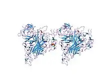 ![]() Trimeric structure of TNF alpha, produced by Mus musculus, based on PDB structure 2TNF (1.4 Å Resolution). Different colors represent different monomers. Baeyens, KJ et al. (1999).[1] Figure rendered using FirstGlance Jmol. | |||||||||