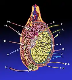 ![]() A diagram of the major components of an adult human testicle, including the following numbered items: 1. Tunica albuginea, 2. Septula testis, 3. Lobulus testis, 4. Mediastinum testis, 5. Tubuli seminiferi contorti, 6. Tubuli seminiferi recti, 7. Rete testis, 8. Ductuli efferentes testis, 9a. Head of epididymis, 9b. Body of epididymis, 9.c Tail of epididymis,10. Vas deferens, 11a. Tunica vaginalis (parietal lamina), 11b. Tunica vaginalis (visceral lamina), and 12. Cavity of tunica vaginalis. | |