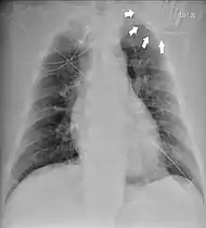 | Chest radiograph showing twiddler's syndrome. The leads of the automated external defibrillator are wrapped around the device and can't be seen in the ventricle. | |