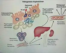 Typhoid is caused by the bacterium Salmonella enterica subsp. enterica serovar Typhi growing in the intestines, peyers patches, mesenteric lymph nodes, spleen, liver, gallbladder, bone marrow and blood.[4][5] Typhoid is spread by eating or drinking food or water contaminated with the feces of an infected person.[6] Risk factors include limited access to clean drinking water and poor sanitation.[2] Those who have not yet been exposed to the pathogen and ingest contaminated drinking water or food are most at risk for developing symptoms.[5] Only humans can be infected; there are no known animal reservoirs.[6]