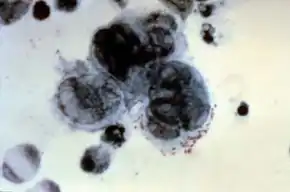 - Microscopic examination using an oil immersion lens. (Look for multinucleated giant cells)[7]