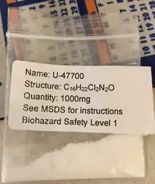- Elliott SP, Brandt SD, Smith C (August 2016). "The first reported fatality associated with the synthetic opioid 3,4-dichloro-N-[2-(dimethylamino)cyclohexyl]-N-methylbenzamide (U-47700) and implications for forensic analysis". Drug Testing and Analysis. 8 (8): 875–879. doi:10.1002/dta.1984. PMID 27232154. S2CID 205762837.