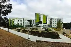 Most of the campus buildings serve an academic, research, or administrative purpose. Exceptions are the Rita Atkinson Residences, which houses 450 graduate students in a nine-story, two-tower structure,[9] and the Club Med dining facility at the base of the telemedicine building. The campus features two Stuart Collection works. Terrace, by Jackie Ferrara, consists of three tiled terraces which flow into one another to connect both wings of the Cellular and Molecular Medicine facility. It is the ninth work in the collection.[10] The fourteenth work, Standing by Kiki Smith, is a nude bronze woman raised on a concrete eucalyptus trunk trickling water from her hands to its roots. It was the artist's first permanent outdoor sculpture.[11]