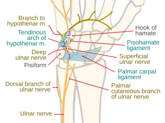 Ulnar tunnel syndrome, also known as Guyon's canal syndrome or Handlebar palsy, is caused by entrapment of the ulnar nerve in the Guyon canal as it passes through the wrist.[1] Symptoms usually begin with a feeling of pins and needles in the ring and little fingers before progressing to a loss of sensation and/or impaired motor function of the intrinsic muscles of the hand which are innervated by the ulnar nerve. Ulnar tunnel syndrome is commonly seen in regular cyclists due to prolonged pressure of the Guyon's canal against bicycle handlebars. Another very common cause of sensory loss in the ring and pink finger is due to ulnar nerve entrapment at the cubital tunnel near the elbow, which is known as cubital tunnel syndrome.