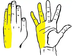 Cartoon depiction of classic ulnar sensory distribution, including mid-4th and 5th fingers. Note that this diagram does not portray hand muscles affected by ulnar neuropathy.