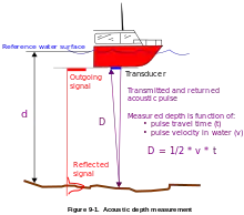 It involves transmitting acoustic waves into water and recording the time interval between emission and return of a pulse; the resulting time of flight, along with knowledge of the speed of sound in water, allows determining the distance between sonar and target. This information is then typically used for navigation purposes or in order to obtain depths for charting purposes. Distance is measured by multiplying half the time from the signal's outgoing pulse to its return by the speed of sound in the water, which is approximately 1.5 kilometres per second [T÷2×(4700 feet per second or 1.5 kil per second )] For precise applications of echosounding, such as hydrography, the speed of sound must also be measured typically by deploying a sound velocity probe into the water. Echo sounding is effectively a special purpose application of sonar used to locate the bottom. Since a traditional pre-SI unit of water depth was the fathom, an instrument used for determining water depth is sometimes called a fathometer. The first practical fathometer was invented by Herbert Grove Dorsey and patented in 1928.[8]