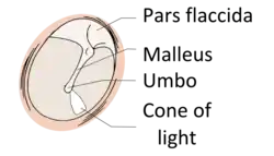 The manubrium (Latin: handle) of the malleus is firmly attached to the medial surface of the membrane as far as its center, drawing it toward the tympanic cavity. The lateral surface of the membrane is thus concave. The most depressed aspect of this concavity is termed the umbo (Latin: shield boss).[7]