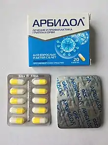 Umifenovir, sold under the brand name Arbidol, is an antiviral medication for the treatment of influenza and COVID infections used in Russia[5] and China. The drug is manufactured by Pharmstandard (Russian: Фармстандарт). It is not approved by the U.S. Food and Drug Administration (FDA) for the treatment or prevention of influenza.[6]
