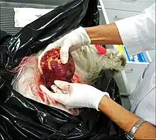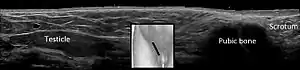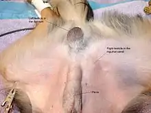 Cryptorchidism is common in male dogs, occurring at a rate up to 10%.[17] This condition is one of the most common congenital defects in purebred dogs (11%), with 14% reported in Siberian Huskies.[18] Although the genetics are not fully understood, it is thought to be a recessive, and probably polygenetic, trait.[19] Some have speculated that it is a sex-limited autosomal recessive trait;[20] however, it is unlikely to be simple recessive.[19] Dog testes usually descend by 10 days of age and it is considered to be cryptorchidism if they do not descend by the age of eight weeks.[21] Cryptorchidism can be either bilateral (causing sterility) or unilateral, and inguinal or abdominal (or both). Because it is an inherited trait, affected dogs should not be bred and should be castrated. The parents should be considered carriers of the defect and a breeder should thoughtfully consider whether to breed the carrier parent or not. Littermates may be normal, carriers, or cryptorchid. Castration of the undescended teste(s) should be considered for cryptorchid dogs due to the high rate of testicular cancer, especially Sertoli cell tumors.[21] The incidence of testicular cancer is 13.6 times higher in dogs with abdominally retained testicles compared with normal dogs.[17] Testicular torsion is also more likely in retained testicles. Surgical correction is by palpation of the retained testicle and subsequent exploration of the inguinal canal or abdomen, but showing altered dogs is against AKC rules, making this correction pointless for breeding stock. Orchiopexy is an option for pet dogs that will not be used for breeding.