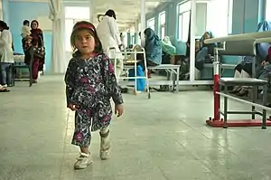 | A girl with a congenital, structural difference in leg lengths walking in a clinic. | |