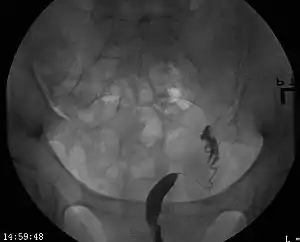 | A unicornuate uterus as seen on a hysterosalpingogram | |