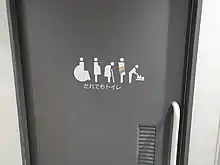 As of 2016, no laws were in place regarding the usage of public toilets in relation to gender identity. There may, however, be occasional signs outside public toilets to indicate that the stall is "gender free".[54] The Tokyo city government was planning to install one unisex toilet in at least seven out of eleven of the buildings being used for the Olympic Games that were planned for 2020.[55]