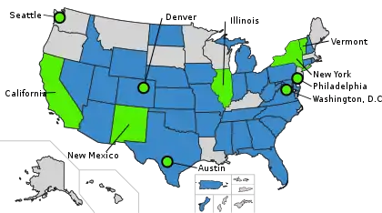 In most jurisdictions, local governments have the ability to pass ordinances, so long as they do not conflict with state law. San Francisco (California), Philadelphia (Pennsylvania), Seattle (Washington), Washington (District of Columbia), Berkeley (California), Cathedral City (California), West Hollywood (California), Austin (Texas), Cleveland (Ohio), New York City, Denver (Colorado),[67] and the US states of Vermont, New Mexico, New York State,[68] Illinois, and California - have passed measures mandating that single-occupancy toilets in public spaces be labeled as unisex (or gender-neutral).[69][70][71] In 2022, California enacted legislation allowing cities to build multi-stall gender-neutral bathrooms.[72] Additionally, the 2021 edition of the International Plumbing Code (in use by 35 states, Puerto Rico, Guam, and DC) will require the same as individual states adopt the new edition of the code.[73][74]