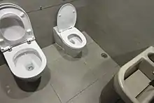 The earliest known example of a western sex-separated public toilet was a temporary installation that occurred in 1739 at a Parisian ball.[84] This involved chamber boxes in separate rooms with attendants guiding visitors to the appropriate location.[84] According to sociologist and author Sheila Cavanagh, this was seen by the guests as "sort of a novelty - something eccentric and fun."[84] She argues that this was done to accentuate sexual difference, and project that difference onto public space.[79]
