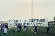 The Democratic Party's platform endorses the abortion-rights position, stating that abortion should be "safe and legal".[17] Not all Democrats agree with the platform, however, and there is a small anti-abortion faction within the party, expressed in such groups as Democrats for Life of America.[18] Similarly, there is a small abortion-rights faction within the Republican Party. The Libertarian Party platform holds "that government should be kept out of the matter" of abortion.[19]