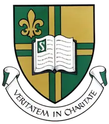 Université de Sherbrooke's arms, supporters, flag, and badge were registered with the Canadian Heraldic Authority on January 15, 2004.[3] Université de Sherbrooke's crest and Supporters were registered with the Canadian Heraldic Authority on April 20, 2007.[4] The motto of the school is Veritatem in Charitate ("Truth through charity").