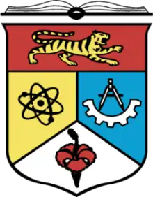The current coat of arms of the National University of Malaysia was first designed by university staff Mohd Aris Atan, and is in use since 1972. It was modified to its present form by publications officer Zulkifli Ibrahim, which was launched on 29 July 2000 in conjunction with the university's 30th anniversary, with stripes added to the tiger's body.[6][7] The arms is depicted as a quartered shield featuring an atomic symbol, a compass, a gear, a Malayan Tiger and the national flower Bunga Raya or hibiscus rosa-sinensis, with an overlaid book placed on top of it. The atomic symbol represents science, the compasses and gear represents technology, the tiger represents strength and courage and the book represents knowledge.[8] It is blazoned:
