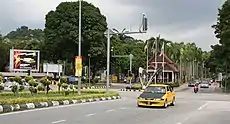 Tierced per pall reversed, the dexter Gules a bend Azure fimbriated Argent charged with a cresent and a fourteen-pointed federal star Or, the sinister Vert a tiger holding a torch and a kris proper and the base Or a Bunga Raya or hibiscus flower also proper.