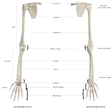 In formal usage, the term "arm" only refers to the structures from the shoulder to the elbow, explicitly excluding the forearm, and thus "upper limb" and "arm" are not synonymous.[2] However, in casual usage, the terms are often used interchangeably. The term "upper arm" is redundant in anatomy, but in informal usage is used to distinguish between the two terms.