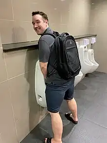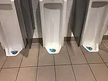 A urinal (US: /ˈjʊərənəl/, UK: /jʊəˈraɪnəl/)[1] is a sanitary plumbing fixture for urination only. Urinals are often provided in public toilets for male users in Western countries (less so in Muslim countries). They are usually used in a standing position. Urinals can be with manual flushing, automatic flushing, or without flushing, as is the case for waterless urinals. They can be arranged as single sanitary fixtures (with or without privacy walls) or in a trough design without privacy walls. Urinals designed for females ("female urinals") also exist but are rare. It is possible for females to use male urinals with a female urination device.[2]