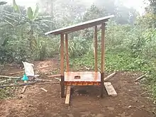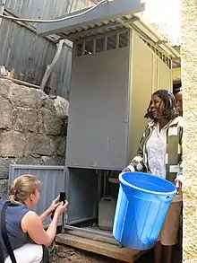 The NGO SOIL in Haiti began building UDDTs and composting plants in Port-au-Prince as part of the 2010 Haiti earthquake emergency relief effort in northern Haiti.[40] They have since branched out into providing toilets for residential use, this being their primary goal moving forward as they transition their focus from emergency relief to providing sustainable and ecological sanitation for paying customers. Their current dry toilet design for households includes a small portable single vault unit made out of wood that is either fitted with a single container for combined excreta collection or with a urine diversion insert, with 80% of these installations currently being of the UDDT type. As of 2014, SOIL has transformed all of their public UDDT vault toilets to an open vault design with removable plastic drums for feces collection. This improves the processes by which feces is collected and transported to their waste treatment facility, making their business now a fully "container-based system".[41] This allows SOIL to respond to heavy use (since their toilets were filling up too quickly) and ensures a safe final product for reuse. In most cases, these UDDTs utilize soak pits (normally located directly beneath the toilet superstructure) for onsite disposal of urine.