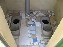 A UDDT consists of several functional elements.[4]: 3 The main ones - which distinguish a UDDT from a pit latrine - are the urine diversion toilet seat or squatting pan, and one or two feces vaults (above ground).