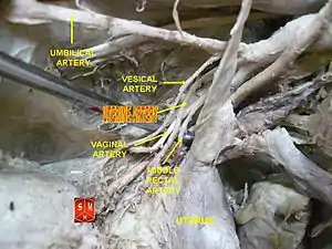 ![]() Arteries of the female reproductive tract: uterine artery, ovarian artery and vaginal arteries. (Uterine artery labeled at center.) | |