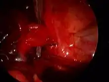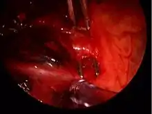 VATS lobectomy is the same as lobectomy performed via thoracotomy in that the pulmonary artery, pulmonary vein, and bronchus to the involved pulmonary lobe are individually dissected, ligated and divided. Generally, endoscopic stapling devices are used to ligate and divide the vessels and the bronchus however conventional suture material can also be used. During VATS lobectomy, the structures being operated on are not directly visualized with the naked eye but are visualized solely with a rigid thoracoscope. A camera attached to the thoracoscope transmits the image to a video screen, which allows surgeons and assistants to observe the flow of the operation. Surgical specimens are placed into a water-tight bag and removed from the chest without morcellization (i.e. breaking up the specimen into small pieces before removal); this prevents seeding of the VATS incisions with tumor cells and allows for an intact specimen for pathology examination and cancer staging. Removal of lymph nodes from the mediastinum is not compromised by VATS and remains a cornerstone of the surgical therapy of lung cancer. Visualization is enhanced due to the magnification afforded by the fiberoptic thoracoscope and a 30-degree angle of visualization aids in looking around corners. However, because the incisions are too small to allow passage of the surgeon's hands into the thorax, the surgeon's tactile input is compromised. VATS operations rely on a thorough understanding of pulmonary anatomy to allow for strategically placed incisions (usually 3–5 incisions total). The main advantages of VATS over thoracotomy are that major muscles of the chest wall are not divided and rib spreaders that can lead to rib fractures or costovertebral joint pain are not used. This results in a hospital length of stay after VATS lobectomy generally reported to range from 3–5 days,[4] or roughly half that for lobectomy via thoracotomy.