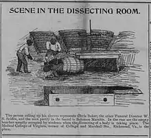 From its beginning, the Medical College of Richmond, Virginia, boasted of its unique ability to acquire medical cadavers in abundance. It was routinely stated in their advertisements.[38][39][40] As such was the case in the May 11, 1838 edition of the Richmond Enquirer, which stated: "In no city in our Union are anatomical materials so abundant and easily procured as Richmond..."[41] What was not stated was that the anatomical material was acquired through participation in the illegal cadaver trade, through grave robbing. There were many persons involved in the practice of grave robbing for the medical college, including various hired resurrectionists, medical students, the demonstrator of anatomy, as well as the professor of anatomy.[42][43][44][45][46][47][48][49]