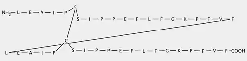 The VIR-576 is a peptide.[7] Consequently, it is a molecule formed by a sequence of amino-acids united by peptide bonds. If we compare both primary structures, it can be seen that the VIR-576 has 2 subunits. Each subunit, monomer is a variant form, a mutant of the VIRIP,[1] differing from four amino acids.
