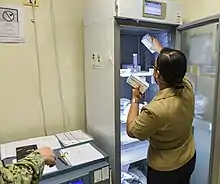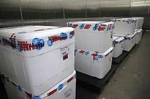 Vaccine storage relates to the proper vaccine storage and handling practices from their manufacture to the administration in people.[2] The general standard is the 2–8 °C cold chain for vaccine storage and transportation. This is used for all current US Food and Drug Administration (FDA)-licensed human vaccines and in low and middle-income countries. Exceptions include some vaccines for smallpox, chickenpox, shingles and one of the measles, mumps, and rubella II vaccines, which are transported between −25 °C and −15 °C.[3][4] Some vaccines, such as the COVID-19 vaccine, require a cooler temperature between −80 °C and −60 °C for storage.[4]