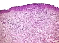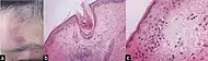 | Lichen sclerosus | Hyperkeratosis, atrophic epidermis, sclerosis of dermis and dermal lymphocytes.[3] | ![]() | ||