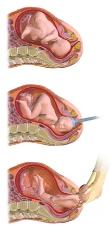 Vacuum extraction (VE), also known as ventouse, is a method to assist delivery of a baby using a vacuum device. It is used in the second stage of labor if it has not progressed adequately. It may be an alternative to a forceps delivery and caesarean section. It cannot be used when the baby is in the breech position or for premature births. The use of VE is generally safe, but it can occasionally have negative effects on either the mother or the child.[1] The term comes from the French word for "suction cup".