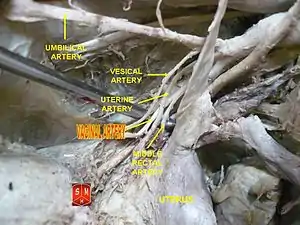 The vaginal artery is usually a branch of the internal iliac artery.[1][2] Some sources say that the vaginal artery can arise from the uterine artery, but the phrase vaginal branches of uterine artery is the term for blood supply to the vagina coming from the uterine artery.[1]
