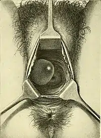 Vaginal cysts are uncommon benign cysts that develop in the vaginal wall.[1][2] The type of epithelial tissue lining a cyst is used to classify these growths.[3] They can be congenital.[4][5][6][7] They can present in childhood and adulthood.[7] The most common type is the squamous inclusion cyst. It develops within vaginal tissue present at the site of an episiotomy or other vaginal surgical sites.[7][8] In most instances they do not cause symptoms and present with few or no complications.[8][4] A vaginal cyst can develop on the surface of the vaginal epithelium or in deeper layers. Often, they are found by the woman herself and as an incidental finding during a routine pelvic examination.[8][9][10][3] Vaginal cysts can mimic other structures that protrude from the vagina such as a rectocele and cystocele.[1][11] Some cysts can be distinguished visually but most will need a biopsy to determine the type.[8][12] Vaginal cysts can vary in size and can grow as large as 7 cm.[1][13] Other cysts can be present on the vaginal wall though mostly these can be differentiated.[8][14] Vaginal cysts can often be palpated (felt) by a clinician. Vaginal cysts are one type of vaginal mass, others include cancers and tumors.[15] The prevalence of vaginal cysts is uncertain since many go unreported but it is estimated that 1 out of 200 women have a vaginal cyst.[1][10] Vaginal cysts may initially be discovered during pregnancy and childbirth. These are then treated to provide an unobstructed delivery of the infant.[1] Growths that originate from the urethra and other tissue can present as cysts of the vagina.[16]