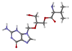 Valganciclovir is a prodrug for ganciclovir, which is a synthetic analog of 2′-deoxy-guanosine. Its structure is the same as ganciclovir, except for the addition of a L-valyl ester at the 5' end of the incomplete deoxyribose ring. The valine increases both the absorption of the drug in the intestines, as well as the bioavailability of the drug once it is absorbed. The L-valyl ester is cleaved by esterases in the intestines and the liver, leaving ganciclovir to be absorbed by the virus-infected cells.[9]