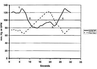 Blood pressure (systolic) and pulse rate during a normal response to a Valsalva maneuver. Forty millimeter mercury pressure is applied at 5 seconds and relieved at 20 seconds.