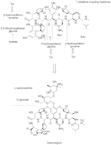 Vancomycin biosynthesis occurs primarily via three nonribosomal protein syntheses (NRPSs) VpsA, VpsB, and VpsC.[47] The enzymes determine the amino acid sequence during its assembly through its 7 modules. Before vancomycin is assembled through NRPS, the non-proteinogenic amino acids are first synthesized. L-tyrosine is modified to become the β-hydroxytyrosine (β-HT) and 4-hydroxyphenylglycine (4-Hpg) residues. 3,5 dihydroxyphenylglycine ring (3,5-DPG) is derived from acetate.[48]