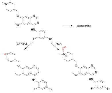 Metabolites of vandetanib (top left): N-desmethylvandetanib (bottom left, via CYP3A4), vandetanib-N-oxide (bottom right, via FMO1 and FMO3), both pharmacologically active, and a minor amount of a glucuronide.[11]