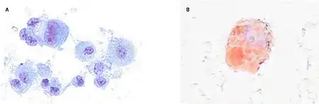Bronchoalveolar lavage specimens may exhibit an increased level of neutrophils in combination with lymphocytes and vacuole-laden macrophages.[21] Lavage cytology with oil red O staining demonstrated extensive lipid-laden alveolar macrophages.[59][60] In the few cases in which lung biopsies were performed, the results were consistent with acute lung injury and included a broad range of features, such as acute fibrinous pneumonitis, diffuse alveolar damage, lipid-laden macrophages, and organizing pneumonia.[34][55] Lung biopsies often showed neutrophil predominance as well, with rare eosinophils.[57]